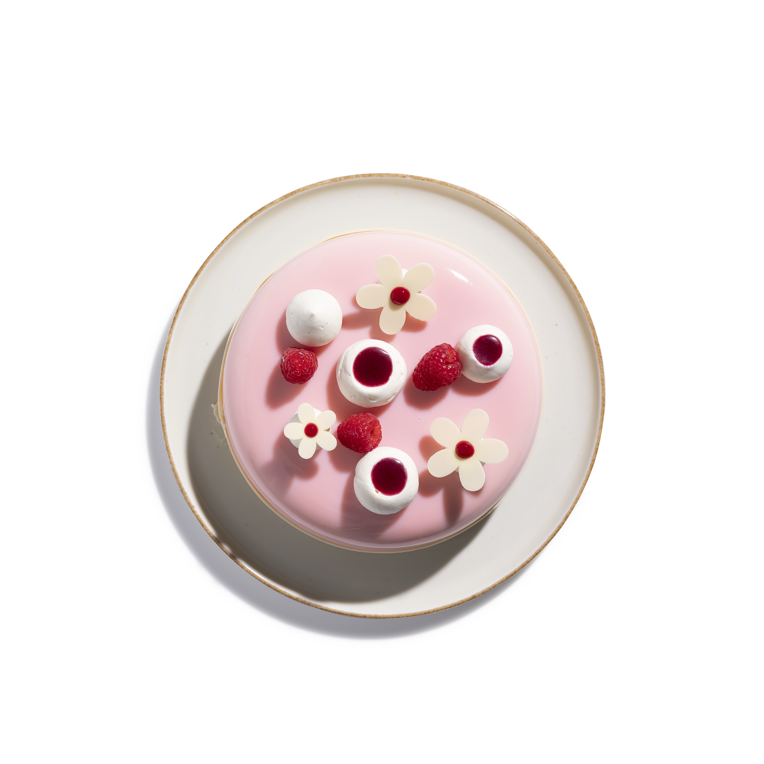 Gebruik het glazuur bij 35°C om de entremets te bedekken en decoreer vervolgens met vers fruit, chocoladedecoraties en toefjes vanillemousse.